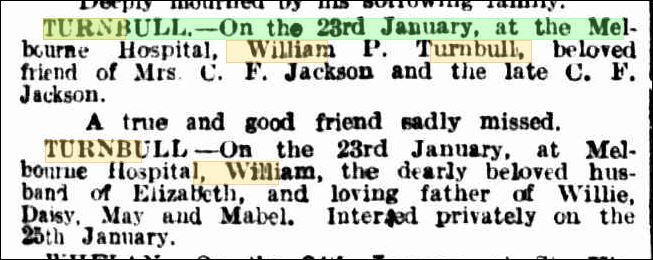 - [S2133] MyHeritage.com, online https://www.myheritage.com/research/record-10547-1791882/arthur-standfast-turnbull-in-australia-victoria-death-index, Australia, Victoria Death Index, 1836-1985. Hereinafter cited as MyHeritage.com.