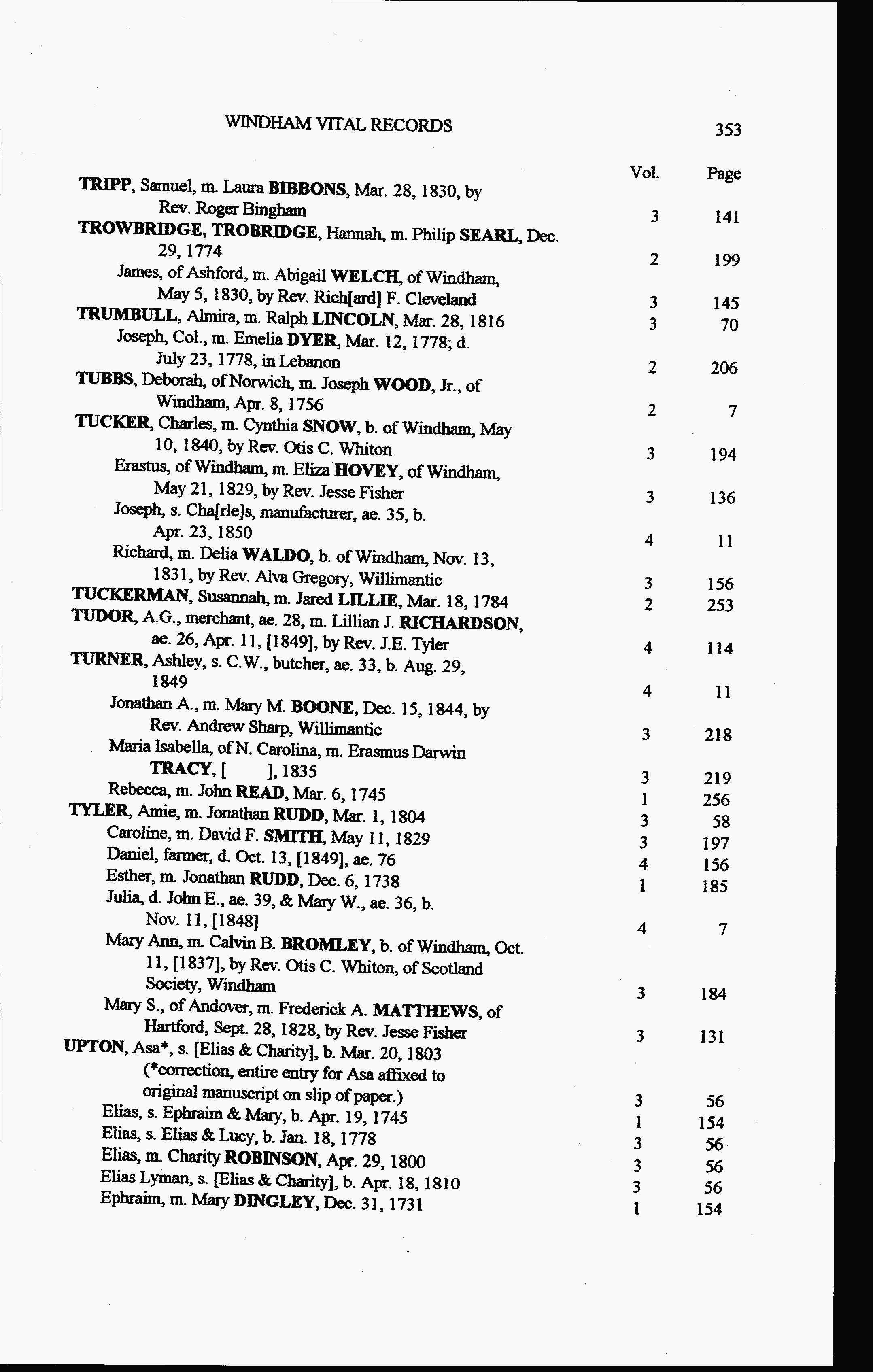 - [S14898] Ancestry.com, Connecticut, U.S., Town Marriage Records, pre-1870 (Barbour Collection) (Name: Ancestry.com Operations Inc; Location: Lehi, UT, USA; Date: 2006;), Genealogical Publishing Co.; Baltimore, Maryland, USA; The Barbour Collection of Connecticut Town Vital Records. Vol. 1-55; Author: White, Lorraine Cook, Ed.; Publication Date: 1994-2002; Volume: 54