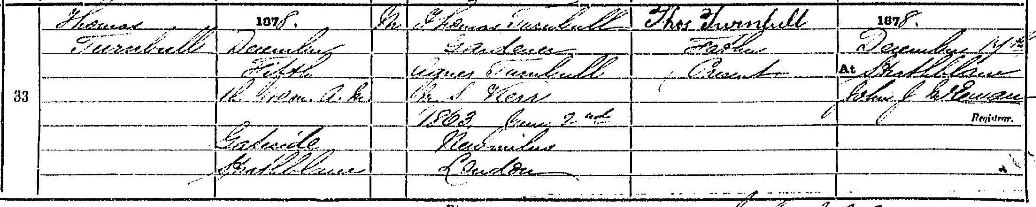 - [S704] Janet Turnbull Schwierking, compiler, TCA Family History Records (Texas: Turnbull Clan Association, March 2006), found Elizabeth Doubrough in a 1911 census age 23 single living with the parents, and siblings as sent to Jennifer in an Email.. so she married after 1911 to Fretz and after 1935 to Thomas Turnbull which makes the son Robert born after 1935. Hereinafter cited as TCA Family Histories.