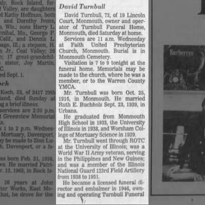 Birth | David Turnbull was born on 25 October 1916 in Monmouth, Warren, Illinois, United States.1,2,4,5,6,7,9,10,11,12,14 |