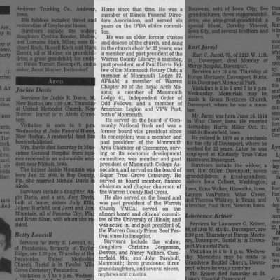 - [S2725] Ancestry.com, U.S., Newspapers.com™ Obituary Index, 1800s-current, The Rock Island Argus; Publication Date: 23 May 1961; Publication Place: Rock Island, Illinois, USA; URL: https://www.newspapers.com/image/610927341/?article=46d864b2-86c4-4e40-8eed-fed92a460d43&focus=0.6243164,0.30430907,0.7411172,0.48681247&xid=3355, See newspaper information provided with each entry.