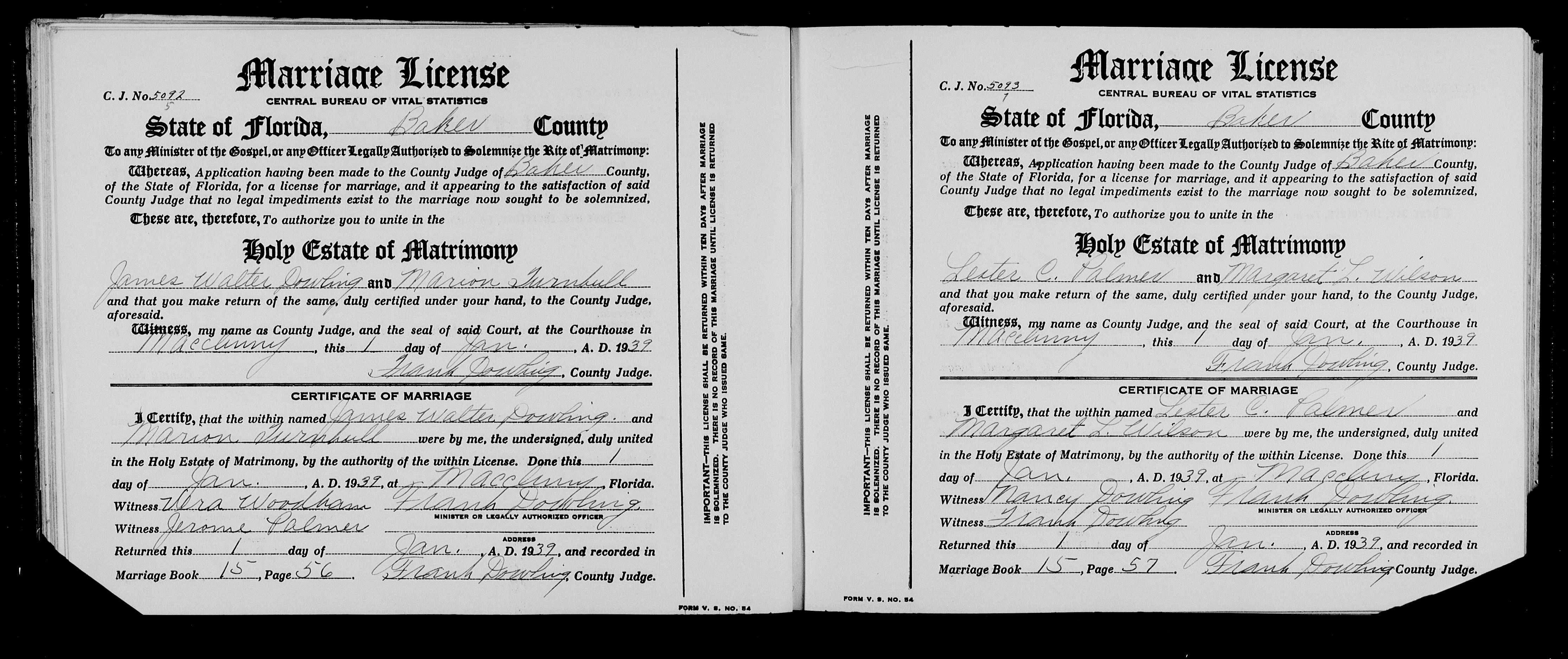 - [S30885] Ancestry.com, Florida, U.S., County Marriage Records, 1823-1982, State Archive, Tallahassee and Clerk of Courts; Various Counties; County Marriages, 1937-1958