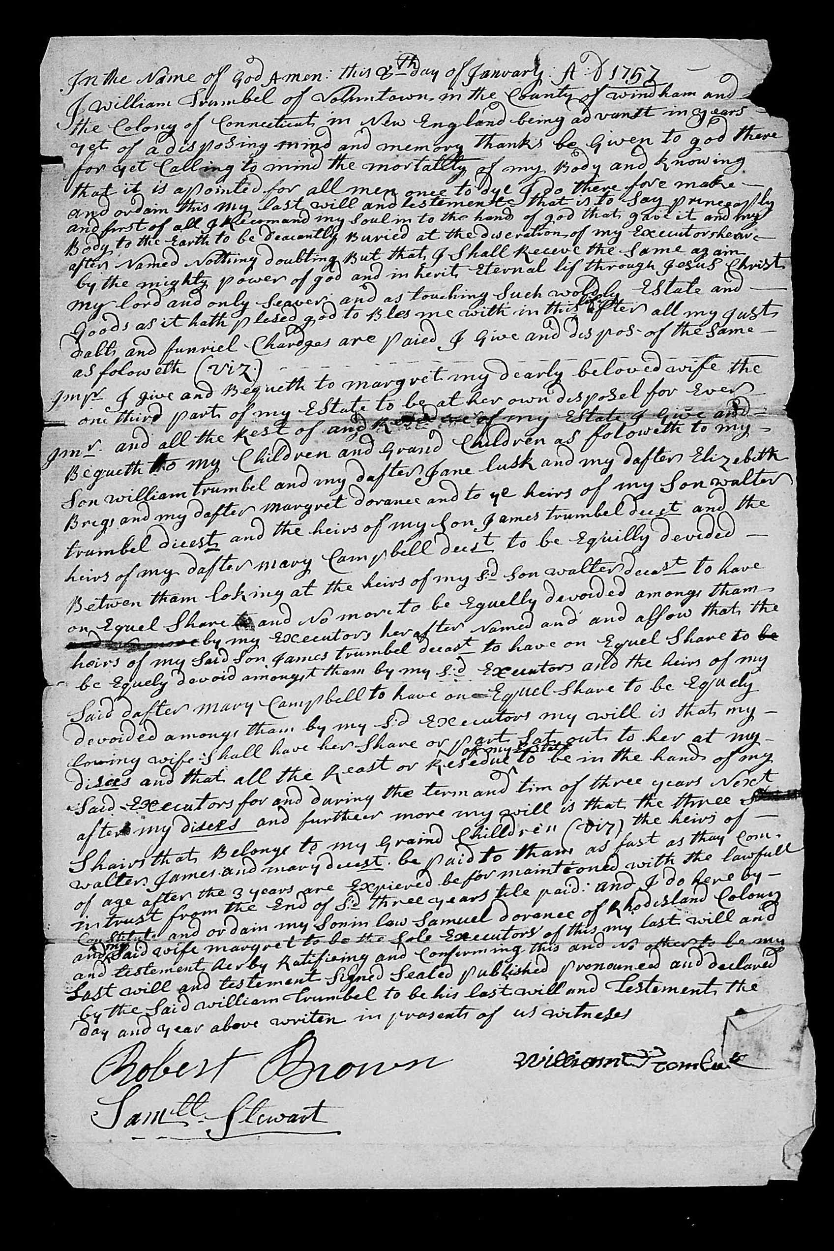 Marriage | He married Jane Campbell about 1736 in Voluntown, New London, Connecticut, USA. Walter Trumbull was, age ~24, Jane Campbell was, age ~16. |