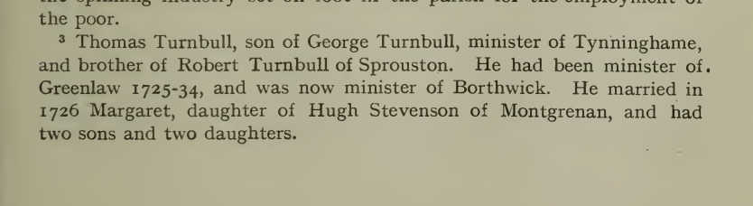 Birth | Rev Thomas Turnbull, Rev, was born on 27 September 1701 in Whitekirk, Haddingtonshire, Scotland. |