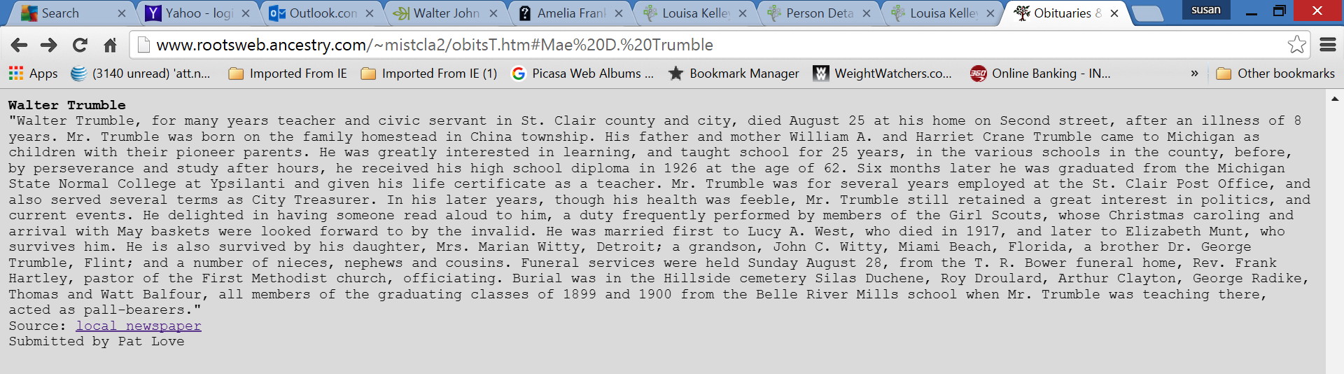 Burial | Walter John Trumble was buried in Saint Clair, St. Clair County, Michigan, United States of America.2 |