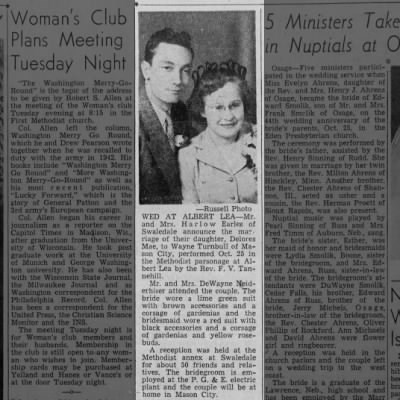 - [S2713] Ancestry.com, U.S., Newspapers.com™ Marriage Index, 1800s-current, Globe-Gazette; Publication Date: 1/ Nov/ 1947; Publication Place: Mason City, Iowa, USA; URL: https://www.newspapers.com/image/391418246/?article=5b821612-0a0d-4006-a6d2-b4320f669cc7&focus=0.62833965,0.062641114,0.745918,0.3427597&xid=3398, See newspaper information provided with each entry.