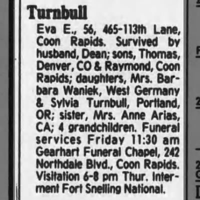 - [S2725] Ancestry.com, U.S., Newspapers.com™ Obituary Index, 1800s-current, Star Tribune; Publication Date: 4 Jul 1985; Publication Place: Minneapolis, Minnesota, USA; URL: https://www.newspapers.com/image/190271230/?article=1b3b0162-62de-46a9-be01-7f62a2ad933a&focus=0.4027701,0.81932,0.4969112,0.88347644&xid=3355, See newspaper information provided with each entry.