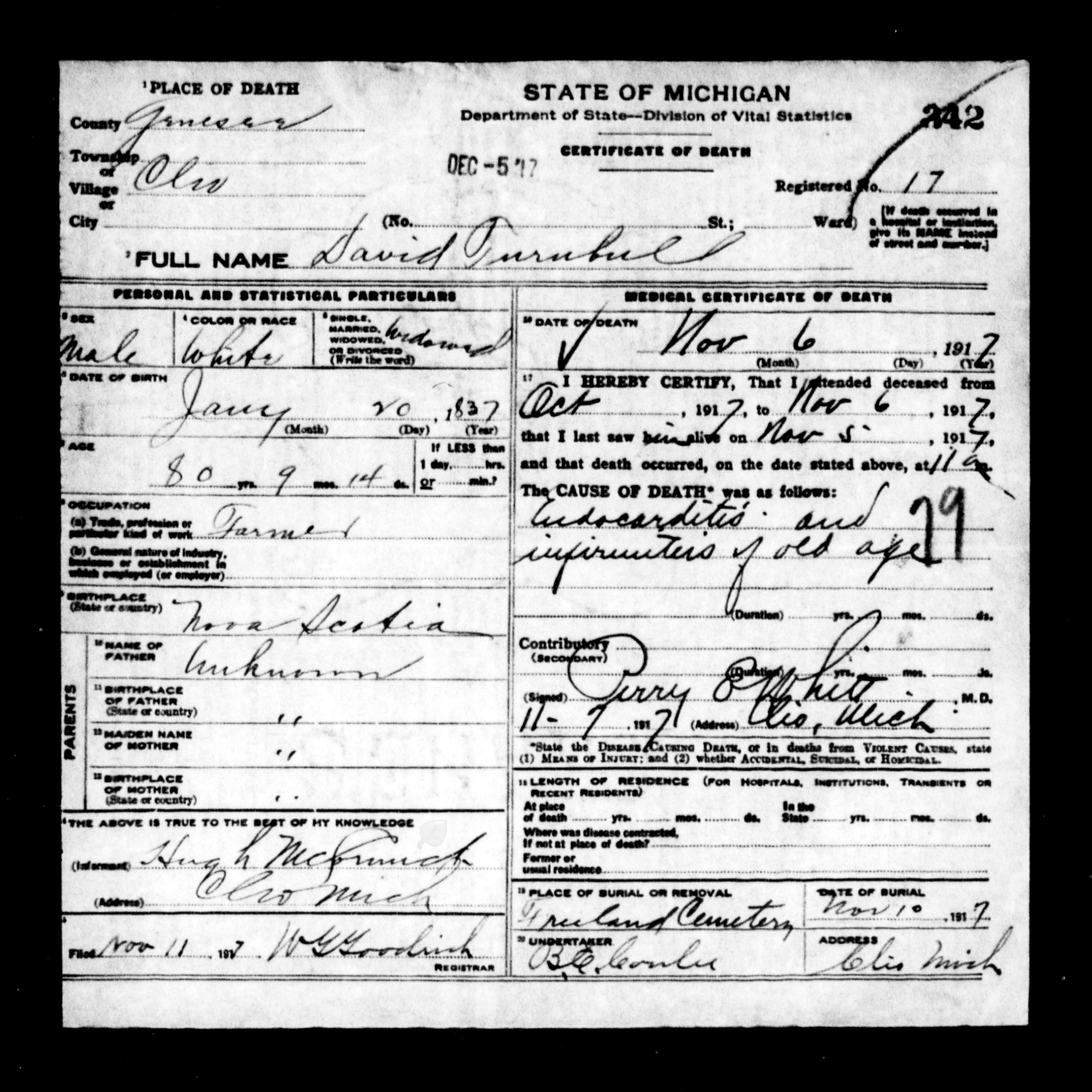 | Burial | He was buried after 14 March 1902 in Freeland, Saginaw County, Michigan, United States of America.4 |