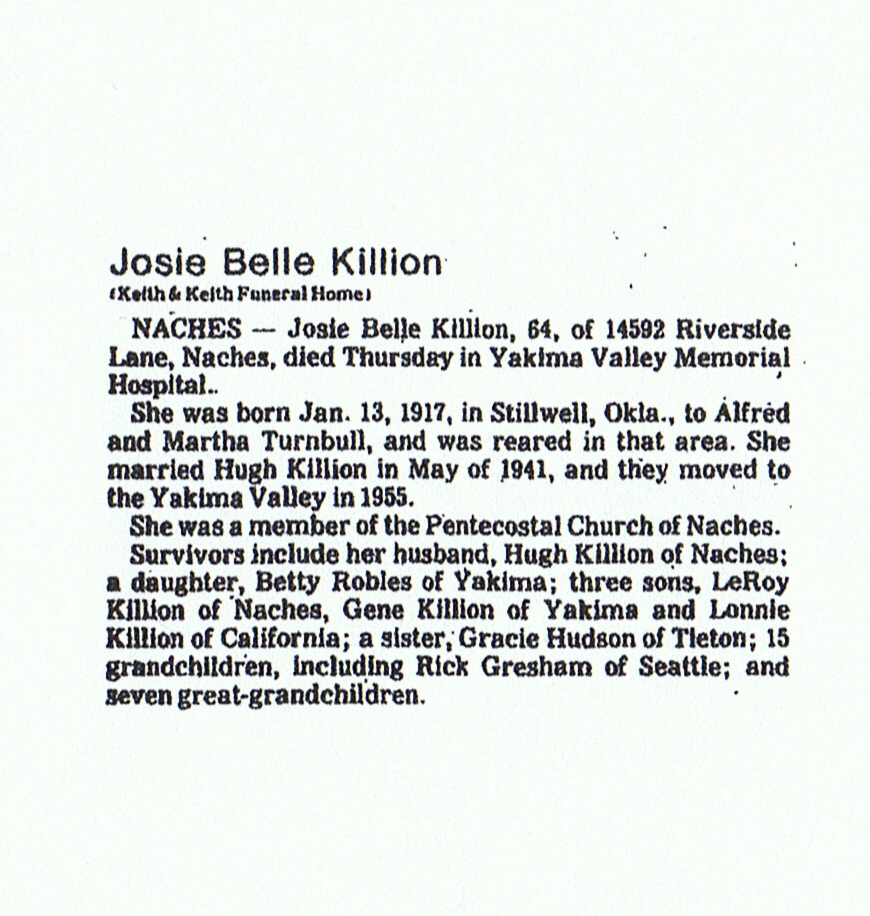 Burial | Josie Belle Turnbull was buried in Yakima, Yakima County, Washington, United States of America.2,5 |