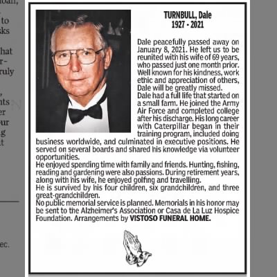 . - [S2769] Ancestry.com, U.S., Obituary Collection, 1930-Current, Arizona Daily Star; Publication Date: 2021; Publication Place: Tucson, USA; URL: https://www.legacy.com/us/obituaries/tucson/name/dale-turnbull-obituary?pid=197478765, See newspaper information provided with each entry.