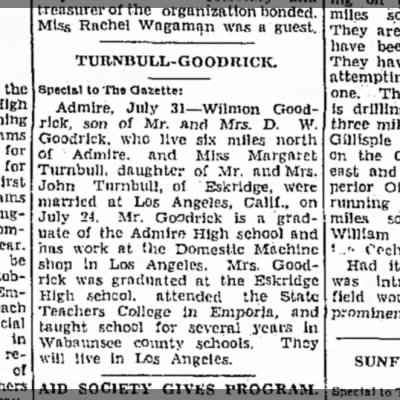 - [S2713] Ancestry.com, U.S., Newspapers.com™ Marriage Index, 1800s-current, The Emporia Gazette; Publication Date: 31/ Jul/ 1937; Publication Place: Emporia, Kansas, USA; URL: https://www.newspapers.com/image/10585865/?article=8d285c10-f21d-43f3-b1af-84812a1c6d48&focus=0.14700045,0.47859886,0.26654163,0.58452296&xid=3398, See newspaper information provided with each entry.