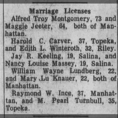 - [S2713] Ancestry.com, U.S., Newspapers.com™ Marriage Index, 1800s-current, The Manhattan Mercury; Publication Date: 1/ Nov/ 1953; Publication Place: Manhattan, Kansas, USA; URL: https://www.newspapers.com/image/423646988/?article=2c3c2163-03a7-4da4-9ce9-1a0128310980&focus=0.16275056,0.7083172,0.2793863,0.73596174&xid=3398, See newspaper information provided with each entry.