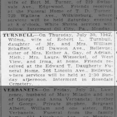 - [S2735] Ancestry.com, 1940 United States Federal Census, Year: 1940; Census Place: Fort Wayne, Allen, Indiana; Roll: m-t0627-01117; Page: 16A; Enumeration District: 94-91, United States of America, Bureau of the Census. Sixteenth Census of the United States, 1940. Washington, D.C.: National Archives and Records Administration, 1940. T627, 4,643 rolls.