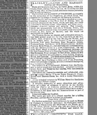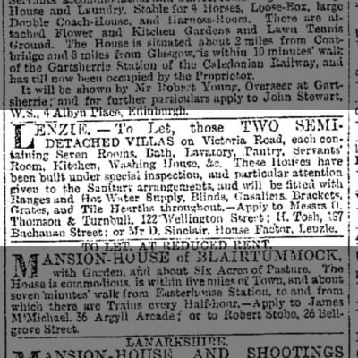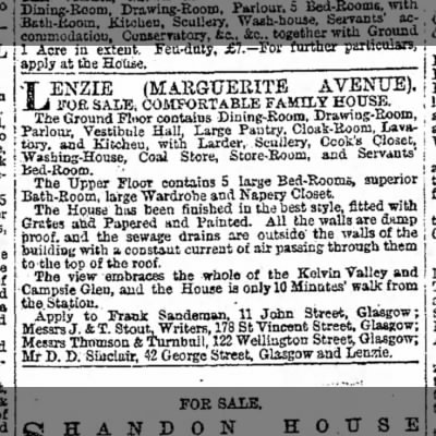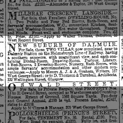 Death | She died Jane Turnbull died childless shortly after moving in to the Villa. According to Dictionary of Scottish Architects. on 22 February 1877 at age ~36 in Ruberslaw, 11 Harriott Rd, Lenzie. |