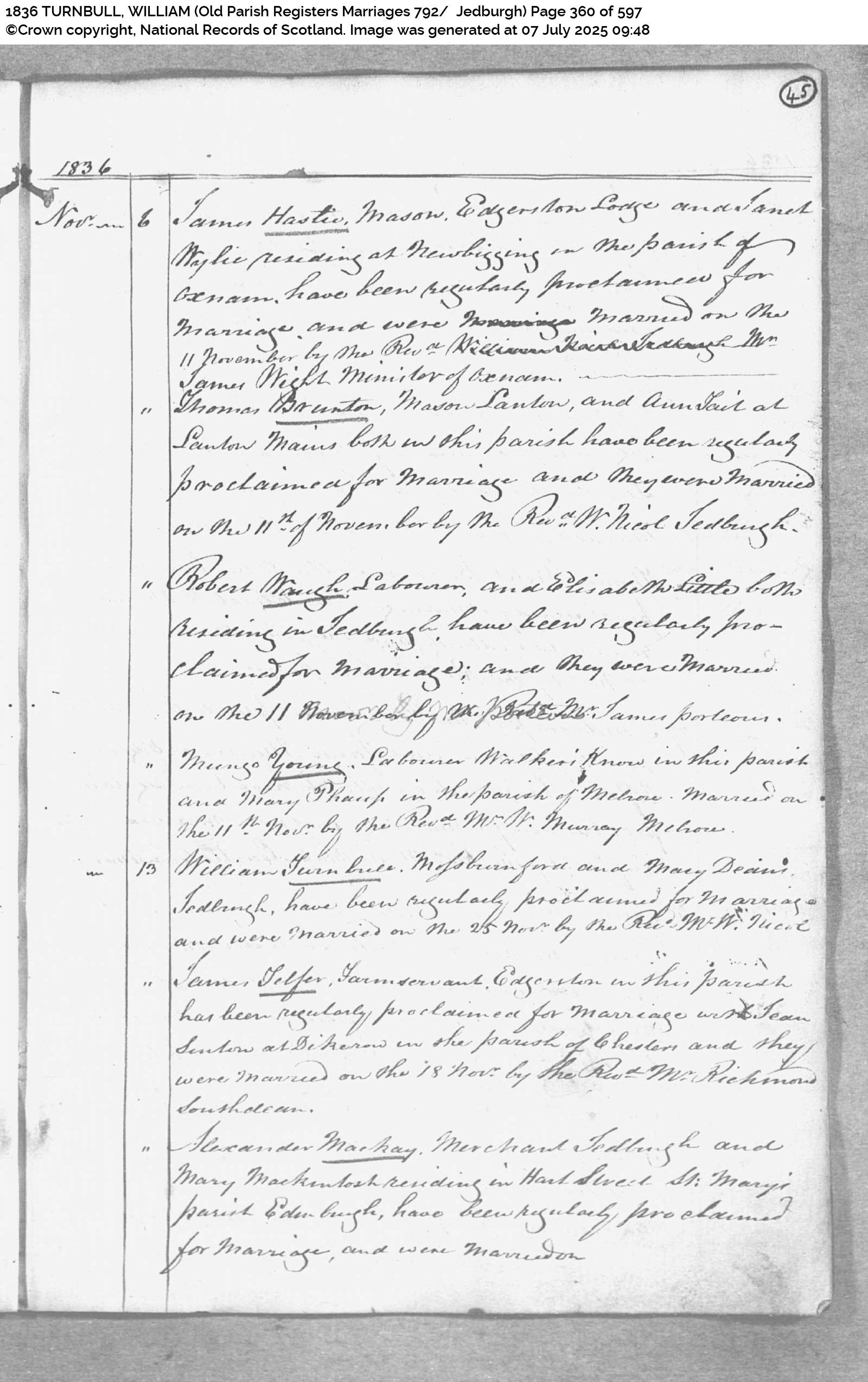 Marriage | He married Mary Deans on 25 November 1836 in Jedburgh, Roxburgh, Scotland. William Turnbull, of Mossburnford, was, age ~29, Mary Deans was, age ~21.1 |
