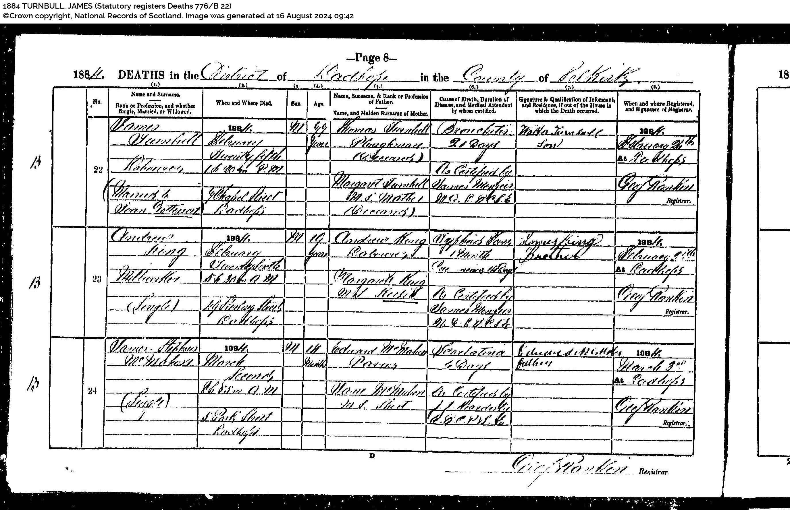 Death | He died on 25 February 1884 at age ~78 in Ladhope, Selkirkshire, Scotland. |