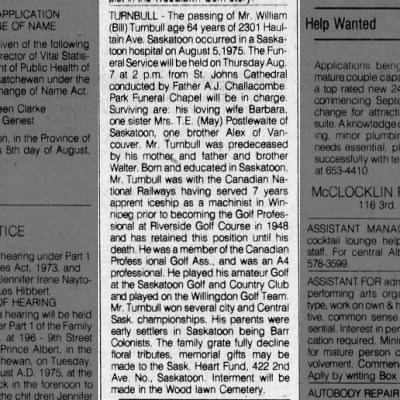 Burial | William Turnbull, Golfer, was buried in Saskatoon, Saskatoon Census Division, Saskatchewan, Canada.1 |