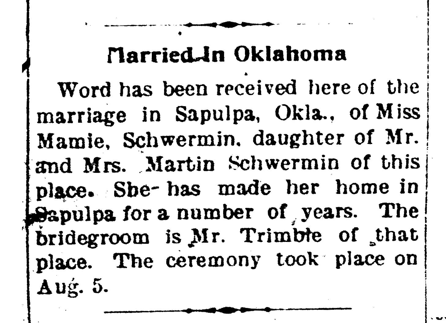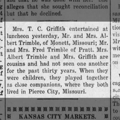 - [S8246] Ancestry.com, Missouri, U.S., Newspapers.com™ Stories and Events Index, 1800's-current (Name: Ancestry.com Operations Inc; Location: Lehi, UT, USA; Date: 2023;), Lawrence Chieftain; Publication Date: 3 Oct 1901; Publication Place: Mount Vernon, Missouri, USA; URL: https://www.newspapers.com/image/335461960/?article=bf328c5e-c316-4ca8-9298-e7f0a4a36a00&xid=5580&terms=Mrs._Ethel_Trimble