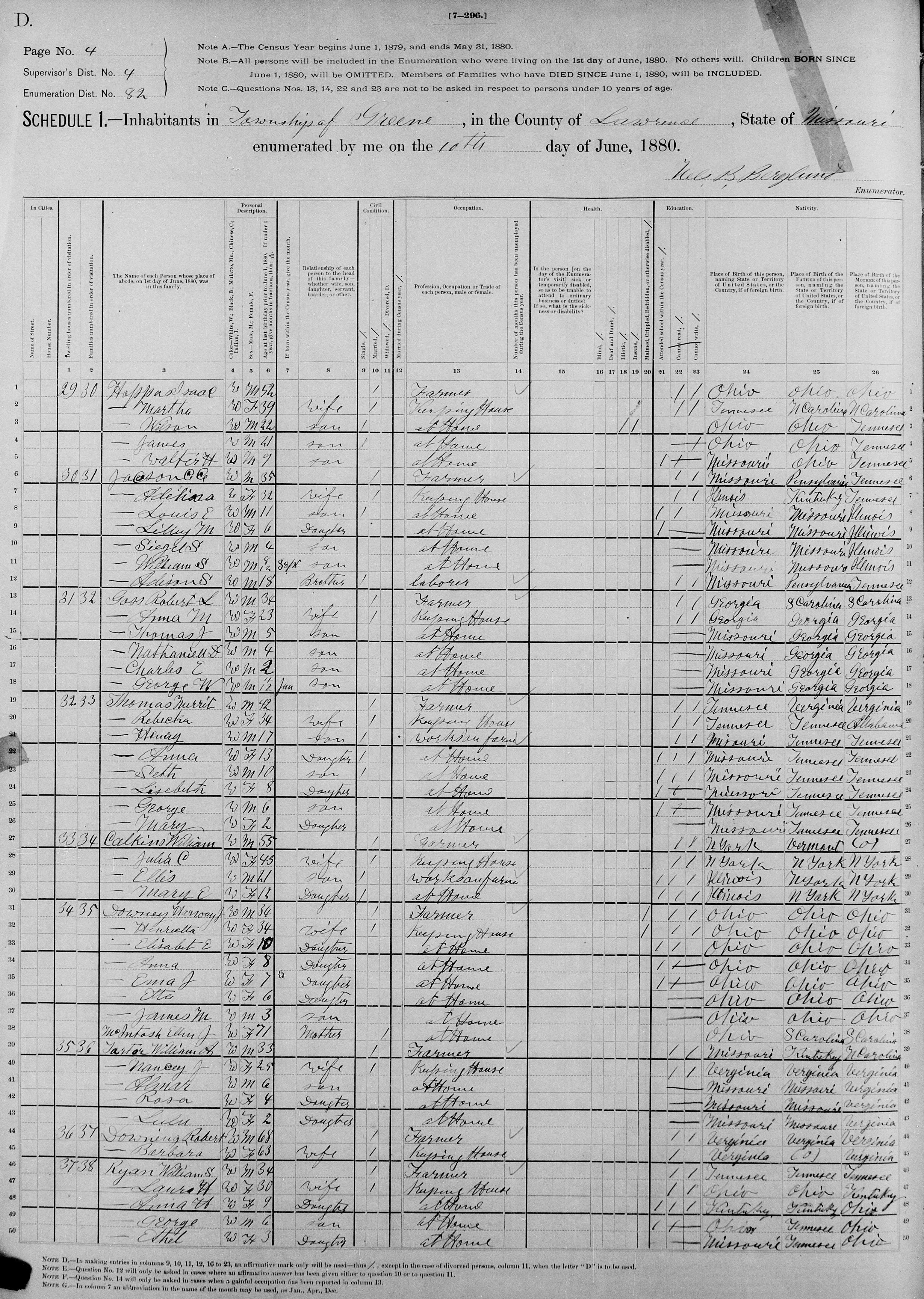 - [S2561] Ancestry.com and The Church of Jesus Christ of Latter-day Saints, 1880 United States Federal Census (Name: Ancestry.com Operations Inc; Location: Provo, UT, USA; Date: 2010;), Year: 1880; Census Place: Greene, Lawrence, Missouri; Roll: 698; Page: 406d; Enumeration District: 082