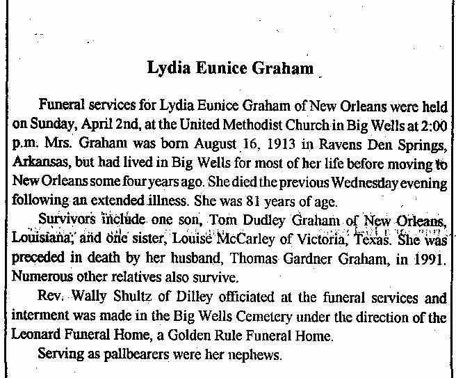 | Burial | Lydia Eunice Wells was buried in Big Wells, Dimmit County, Texas, United States of America.2 |