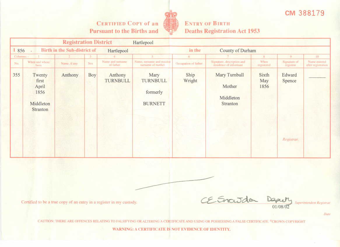 | Baptism | Anthony Turnbull, Blacksmith, was baptized on 14 May 1856 in Stranton, Durham, England.5 |