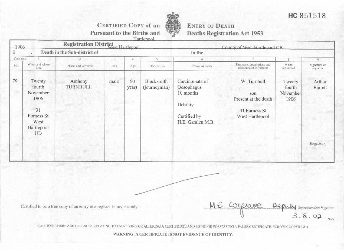 | Birth | Anthony Turnbull was born in 1889 in West Hartlepool, Durham, England.1,2 |