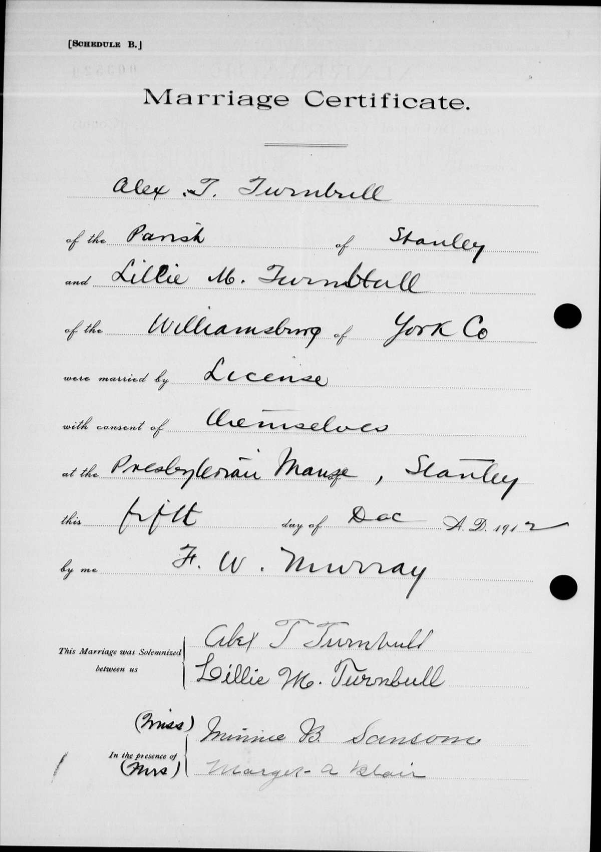 | Marriage | She married Alexander Tierney Turnbull on 5 December 1912 in York County, New Brunswick, Canada. LIillie May Turnbull was, age 40, Alexander Tierney Turnbull was, age 44. |