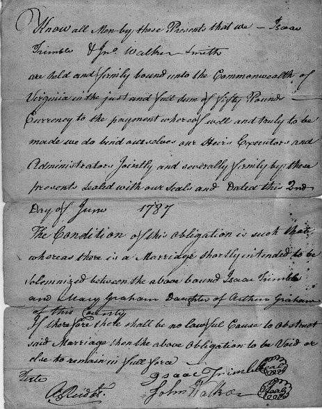 | Marriage | She married Isaac Trimble on 14 June 1787 in Rockridge, Virginia, United States. Mary Polly Graham was, age ~22, Isaac Trimble was, age 31.5,6,7 |