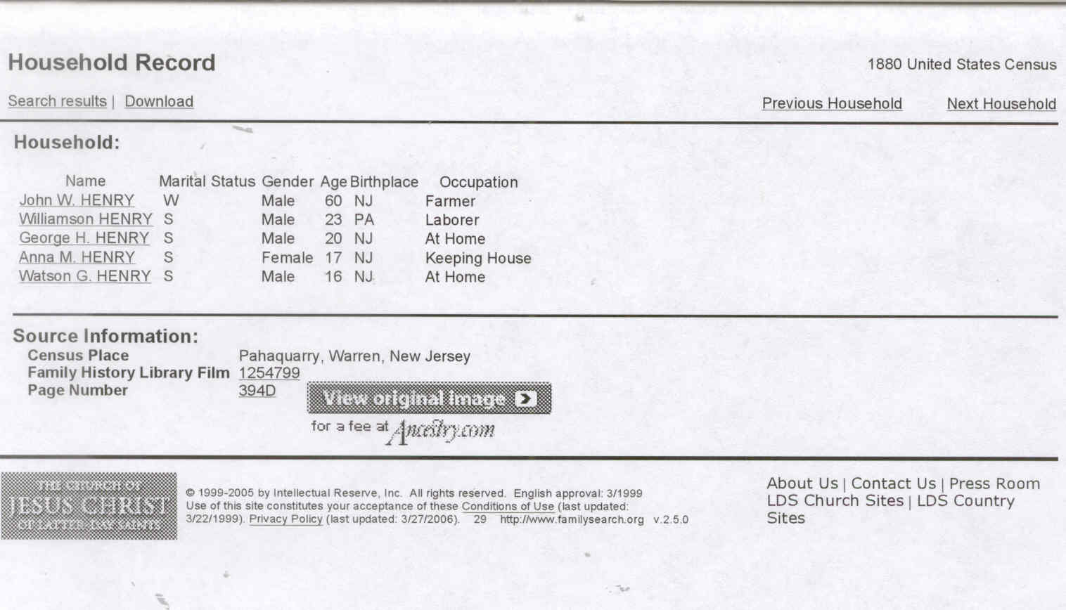 1880 Census Pahaquarry, Warren, New Jersey, USA